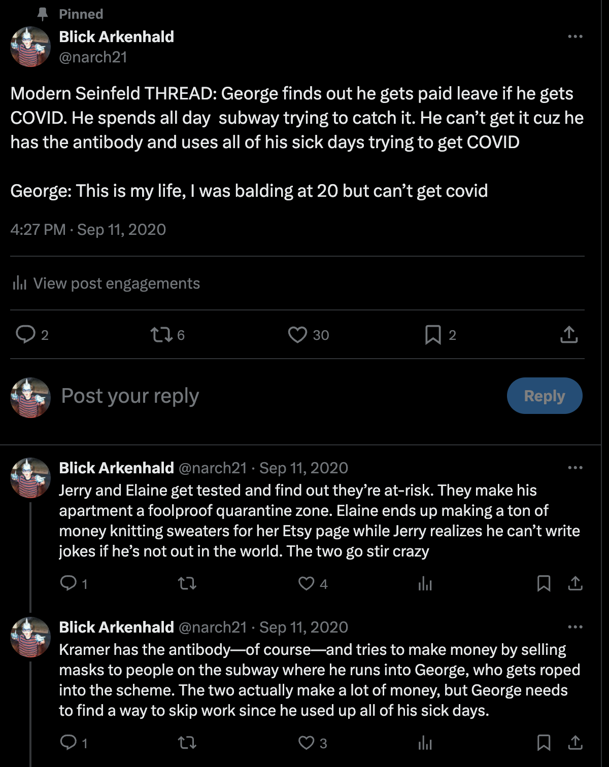 In the midst of the pandemic, I wrote a modern Seinfeld episode via a Twitter thread. It’s gold, Jerry!
